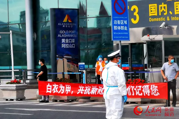 乌鲁木齐机场航站楼前拉起横幅为国家援疆专家组送行。马亮 摄