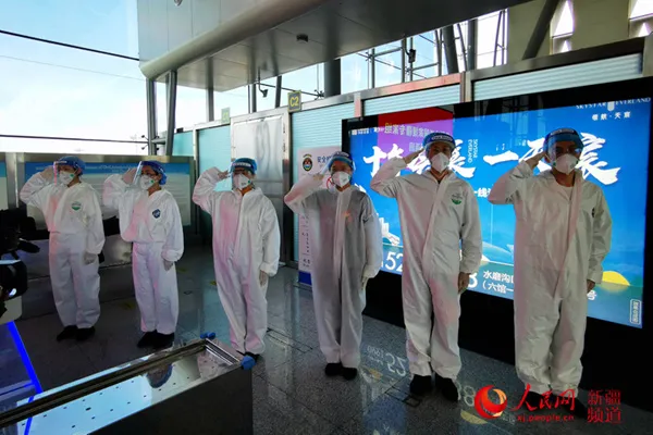 乌鲁木齐机场工作人员向国家援疆专家组致敬。马亮 摄