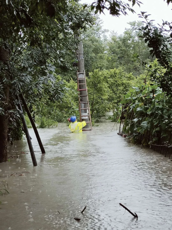 ▲国网四川电力员工在西华大道处理因暴雨地面沉降导致的10千伏辰府路电缆故障 面对特大型暴雨,中国移动四川公司党委带头,第一时间启动应急预案成立应急指挥部,发出通知动员组织基层党组织和党员干部投身防汛救灾保通信工作。