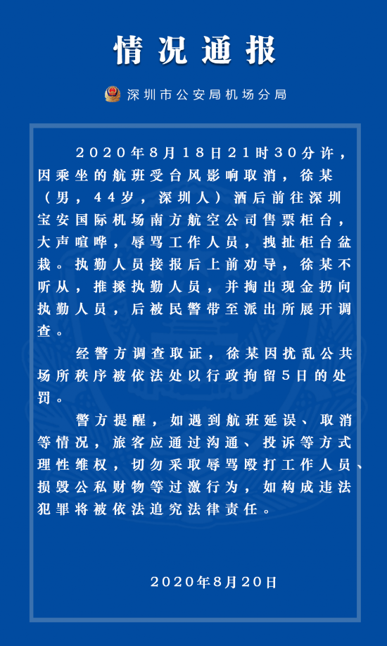荔枝新闻讯 8月20日,深圳市公安局机场分局通报称,8月18日21时30分许,因乘坐的航班受台风影响取消,徐某(男,44岁,深圳人)酒后前往深圳宝安国际机场南方航空公司售票柜合,大声喧哗,辱骂工作人员,拽扯柜台盆栽。执勤人员接报后上前劝导,徐某不听从,推搡执勤人员,并掏出现金扔向执勤人员,后被民警带至派出所展开调查。