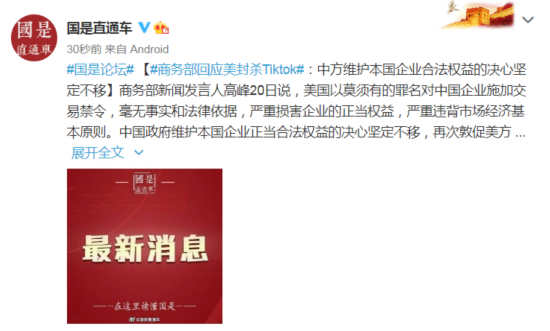 商务部新闻发言人高峰20日说,美国以莫须有的罪名对中国企业施加交易禁令,毫无事实和法律依据,严重损害企业的正当权益,严重违背市场经济基本原则。中国政府维护本国企业正当合法权益的决心坚定不移,再次敦促美方摒弃错误做法,停止对中国企业的无端打压。