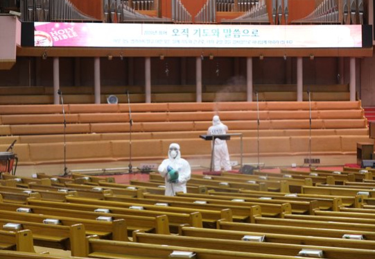 18日上午,防疫人员对首尔汝矣岛“纯福音教会”进行防疫消毒。据悉,汝矣岛“纯福音教会”曾有3名信徒确诊。自确诊病例通报后2周内,该教会转为线上礼拜。 图源:NEWS1