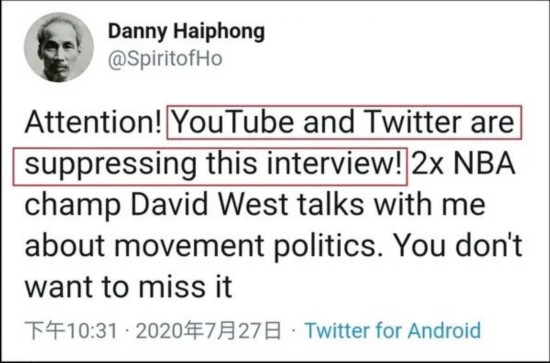 采访结束后,7月27日当天,主持人丹尼曾发推文称,这段采访被Youtube和推特平台“限流”。而截至8月19日,这条视频的流量只有2.8万次。