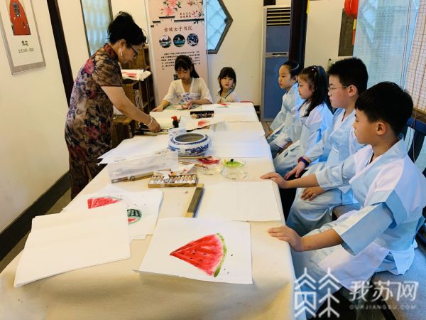 “我们画西瓜的花纹,注意要椭圆形,线条不要太多,六七条就可以了。大片的西瓜注意中间的颜色重,旁边的颜色淡。”江苏美术家协会会员黄敏一边示范一边耐心地向学生们讲解西瓜的画法。