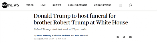 据此前报道,特朗普8月17日接受采访时就曾表示,他打算本周五(21日)在白宫为弟弟罗伯特·特朗普举行葬礼仪式,并称这对罗伯特来说将是“莫大的荣誉”。