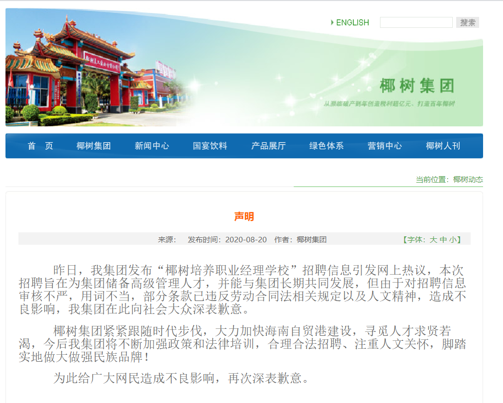 昨日,我集团发布“椰树培养职业经理学校”招聘信息引发网上热议,本次招聘旨在为集团储备高级管理人才,并能与集团长期共同发展,但由于对招聘信息审核不严,用词不当,部分条款已违反劳动合同法相关规定以及人文精神,造成不良影响,我集团在此向社会大众深表歉意。