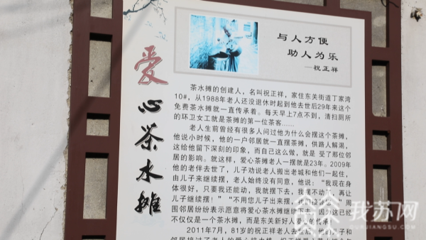 1988年夏天,一位路人在丁家湾中暑倒下,祝正祥连忙从家里端来一大碗茶水,喂下后,那人慢慢苏醒过来,一碗茶救了一条命。祝老寻思:举手之劳,能帮别人如此大忙,不如摆个免费茶水摊吧。从此,这个老巷子里就有了个免费的茶水摊。周边居民戴奶奶告诉记者,“当时扬州的茶水摊子很少。祝爷爷一直坚持下来了。他人品比较好,大家都受感动了,就帮他来弄这个茶摊子。”