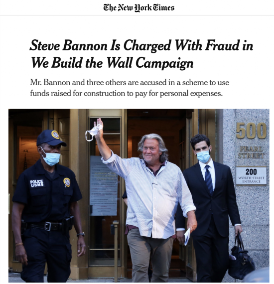 美国《野兽日报》20日援引纽约南区代理联邦检察官奥黛丽·施特劳斯在一份声明中的指控称,班农与退伍军人布赖恩·科尔法奇、安德鲁·巴多拉托、曾为“布赖特巴特新闻”撰稿的蒂莫西·谢伊等人于“我们筑墙”项目中收到了2500万美元的捐款,“骗取了数十万捐款者的钱财,并谎称所有这些钱都将用于建设边境墙。”据美国全国广播公司新闻网(NBC)报道,“我们建墙”的众筹始于2018年底,旨在直接从公众处筹集资金,以在国会的反对下修建特朗普竞选承诺中的美墨边境墙。