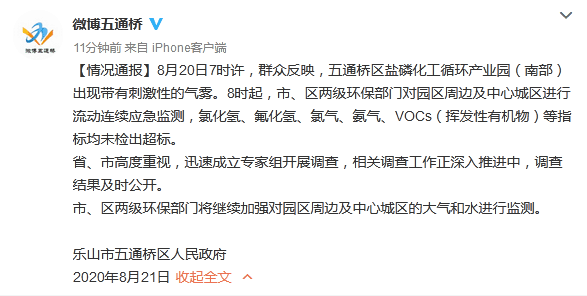荔枝新闻讯 【四川乐山五通桥异味浓雾通报:未检测出超标】据@微博五通桥通报:8月20日7时许,群众反映,五通桥区盐磷化工循环产业园(南部)出现带有刺激性的气雾。8时起,市、区两级环保部门对园区周边及中心城区进行流动连续应急监测,氯化氢、氟化氢、氯气、氨气、VOCs(挥发性有机物)等指标均未检出超标。省、市高度重视,迅速成立专家组开展调查,相关调查工作正深入推进中,调查结果及时公开。市、区两级环保部门将继续加强对园区周边及中心城区的大气和水进行监测。