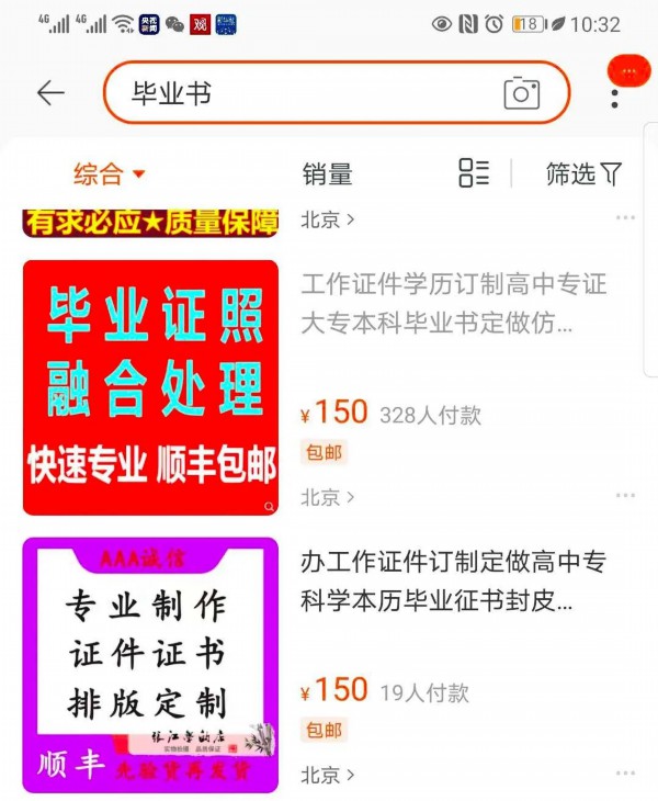 记者近日在淘宝网检索关键词“录取通知书”发现,多家店铺称可定制高校录取通知书,包括专科、本科、研究生录取通知书。部分商品展示页附有多家高校录取通知书封面图片。
