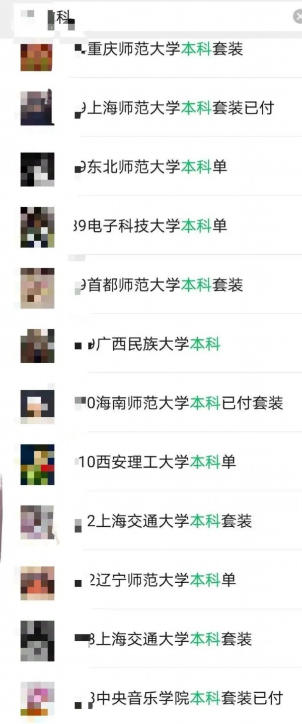 “一周左右收到货,3~4天出电子版。”该卖家提供的名单显示,其可定制包括重庆师范大学、上海师范大学、电子科技大学、中央音乐学院等几十所高校的录取通知书。