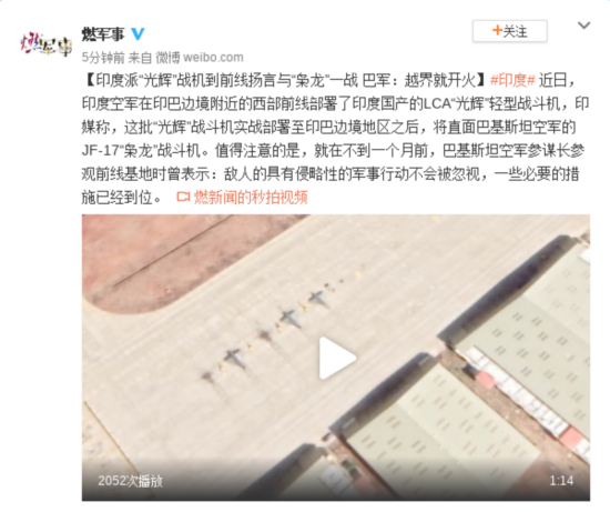 近日,印度空军在印巴边境附近的西部前线部署了印度国产的LCA“光辉”轻型战斗机,印媒称,这批“光辉”战斗机实战部署至印巴边境地区之后,将直面巴基斯坦空军的JF-17“枭龙”战斗机。值得注意的是,就在不到一个月前,巴基斯坦空军参谋长参观前线基地时曾表示:敌人的具有侵略性的军事行动不会被忽视,一些必要的措施已经到位。