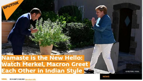 俄罗斯卫星通讯社21日在一篇题为“‘合十礼’成为新的(说)你好方式,看看默克尔与马克龙用印度风互致问候”的报道中提到,本周,马克龙在法国南部瓦尔省布雷冈松堡的法国总统度假地欢迎了专程前来的默克尔,一段视频显示,见到默克尔后,马克龙随即使用“合十礼”表示问候,而默克尔也同样以“合十礼”问候马克龙以及一旁的马克龙妻子布丽吉特。