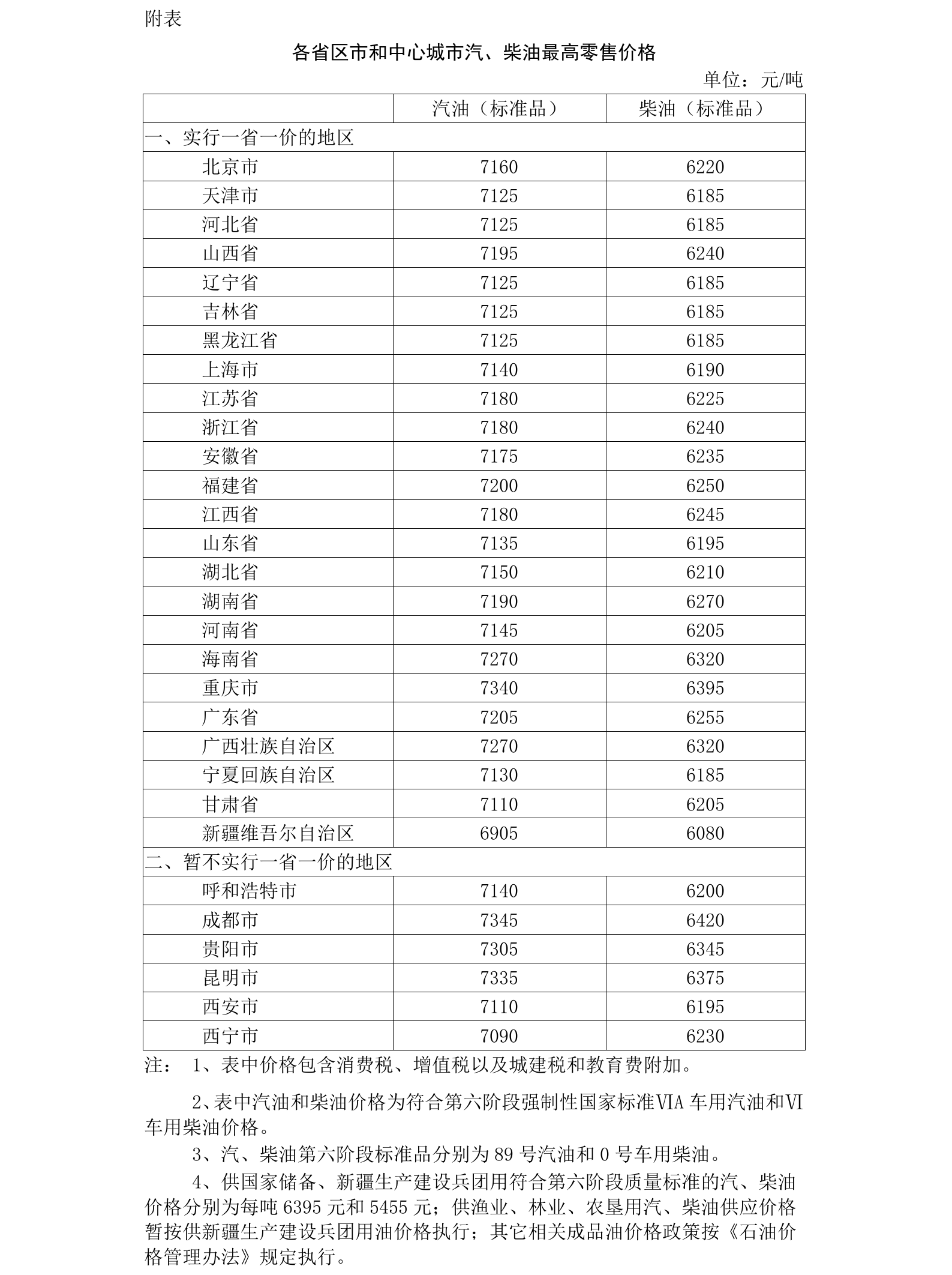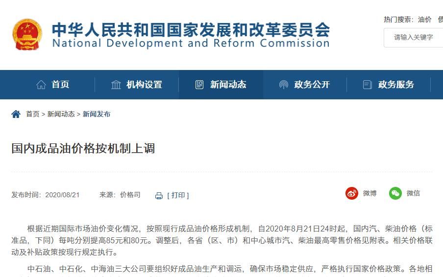 根据近期国际市场油价变化情况,按照现行成品油价格形成机制,自2020年8月21日24时起,国内汽、柴油价格(标准品,下同)每吨分别提高85元和80元。调整后,各省(区、市)和中心城市汽、柴油最高零售价格见附表。相关价格联动及补贴政策按现行规定执行。