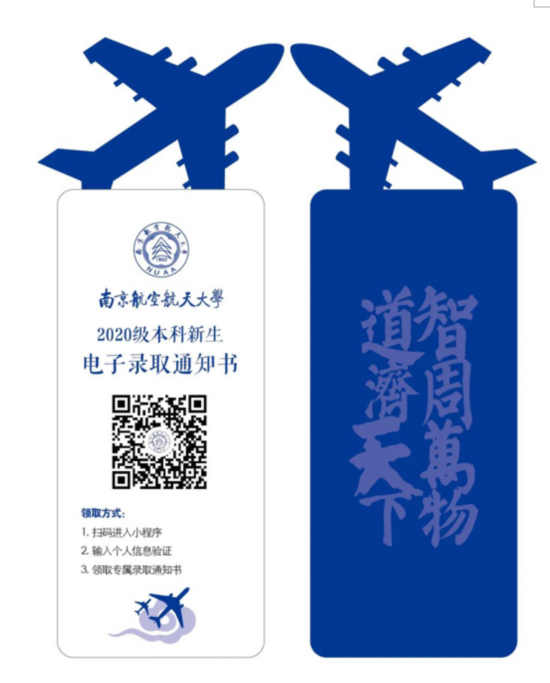 此外,南航纸质版通知书材料由录取通知书、入学纪念卡、荟萃楼手绘图、特色书签和C919飞机纪念封套组成。以红色作为主色调,多处体现南航元素,辅以烫金印制和裁刻工艺,隆重而明快。随纸质通知书一同寄出的,还有给每个新生定制的铝合金纪念卡片,上面标有电子通知书小程序的二维码,值得学生永久珍藏。