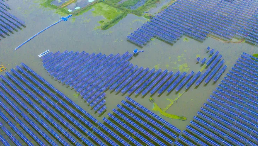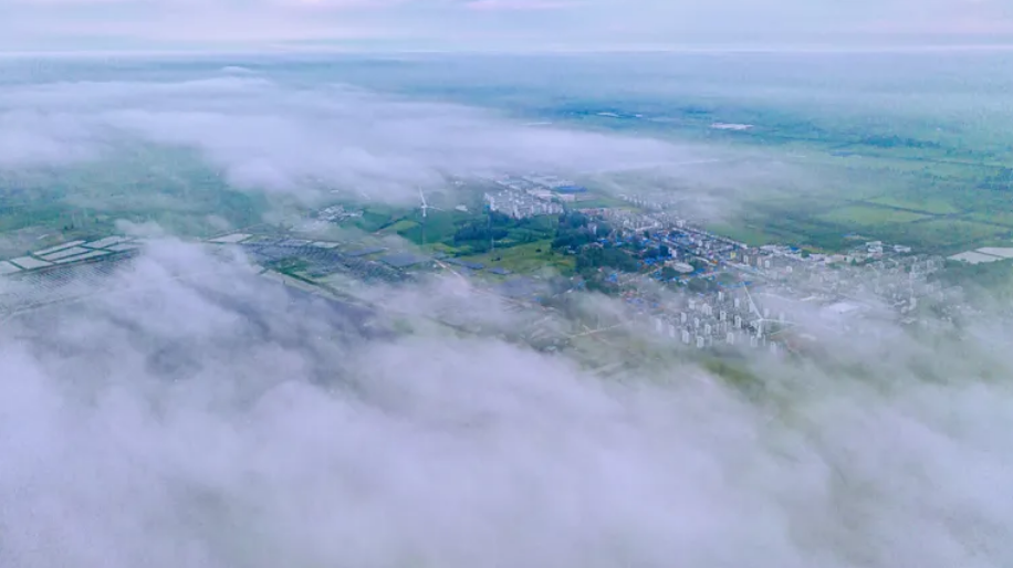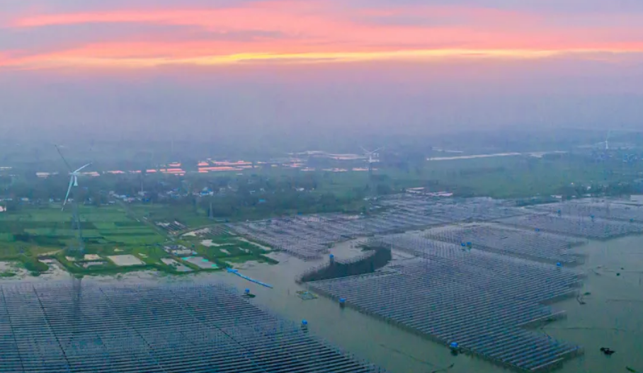 8月20日,雨过天晴,泗洪县天岗湖乡光伏应用领跑基地霞光满天,晨雾弥漫,风光如画。