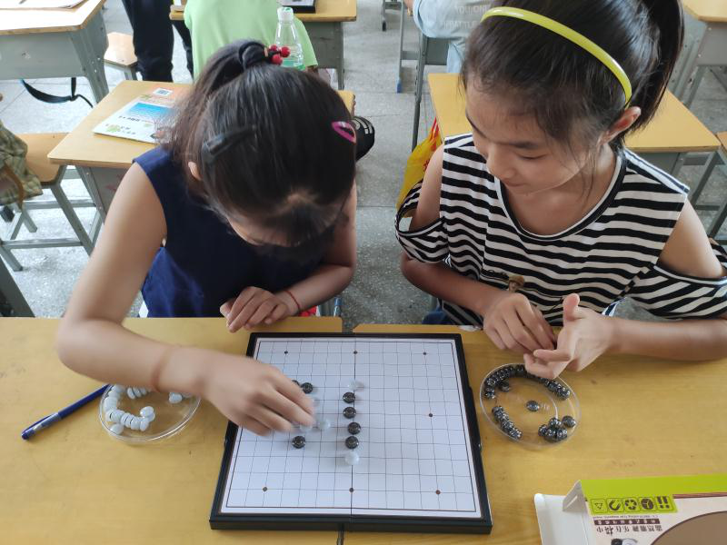五子棋课上,孩子们知道棋盘上有225个交叉点,有113枚黑子、112枚白子,学会了正确执棋方式,懂得了猜先、回合、五连、长连等术语,掌握了如何开局等基本策略;