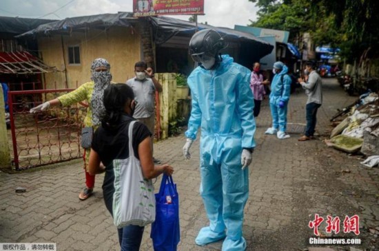 资料图:当地时间2020年7月21日,印度孟买,一名非政府组织的卫生工作志愿者穿着防护衣,戴着装有热扫描传感器的智能头盔在居民区挨户查看居民体温。
