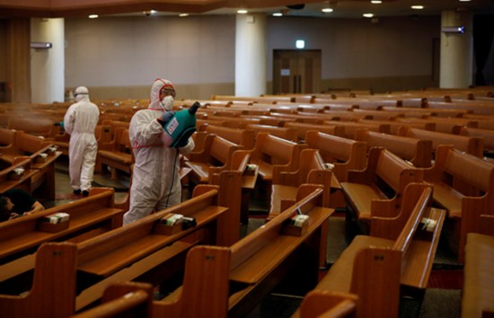 当地时间2020年8月21日,韩国首尔,工作人员给首尔汝矣岛纯福音教堂设施消毒。