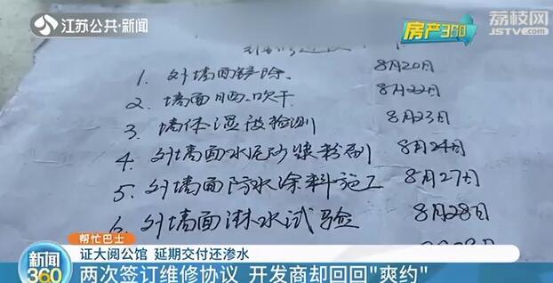 看到这种情况,开发商当场答应维修。8月13日,双方专门签订了一份协议,约定了具体维修工序和开工完工时间。但是,开发商并没有按照协议执行。“8月13号内墙铲完以后,14号就再也没动了。”陈女士说。