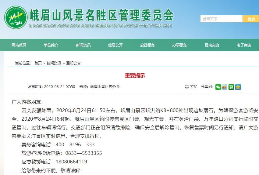 为确保游客游览安全,8月24日8时起,峨眉山景区暂时停售景区门票、观光车票,并在黄湾门禁、万年路口分别实行临时交通管制,过往车辆请绕行。交通部门正在组织清危排险,确保安全后解除管制。