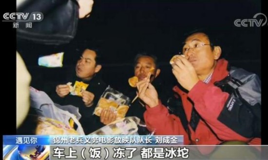 锦州老兵义务电影放映队队长 刘成金:我们当时成立(放映队)的时候约法三章,不怕上山下乡,不吃老百姓一口饭,不拿老百姓一分钱。放电影的时候我们都带盒饭,(那时候盒饭)刚时兴,说吃个盒饭不挺好吗,就把冬天这个时间给忘了,车上冻的都是冰坨。