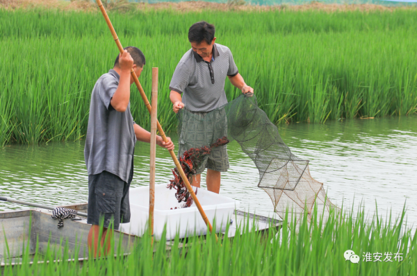 盱眙还大力发展稻虾共生综合种养模式,全县水稻种植面积120万亩,发展稻虾共生面积近100万亩。据悉,稻虾共生种养模式平均亩产小龙虾100公斤、稻谷500公斤,纯收入3000元以上,是单一种植水稻的4倍左右,并且小龙虾由于不受阳光直射,品质也更好。
