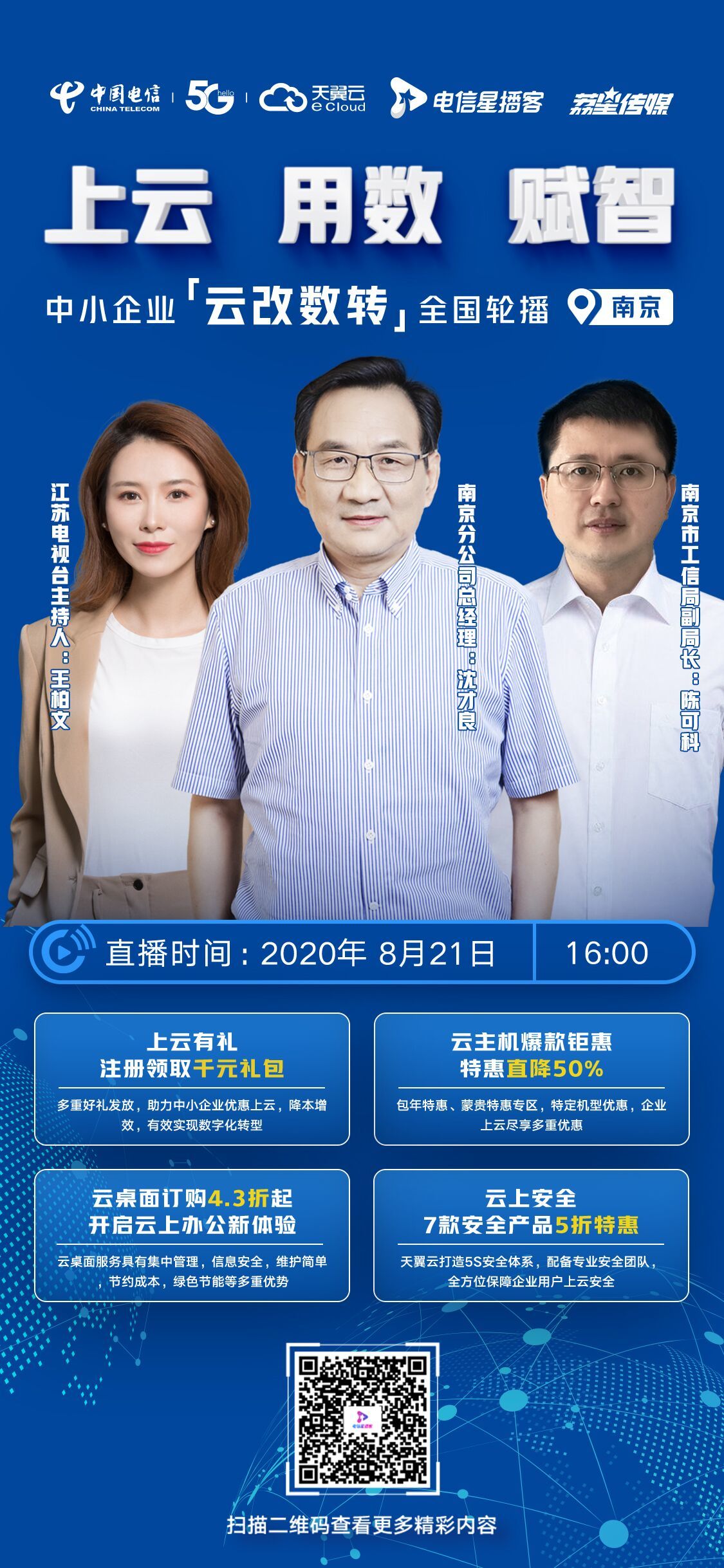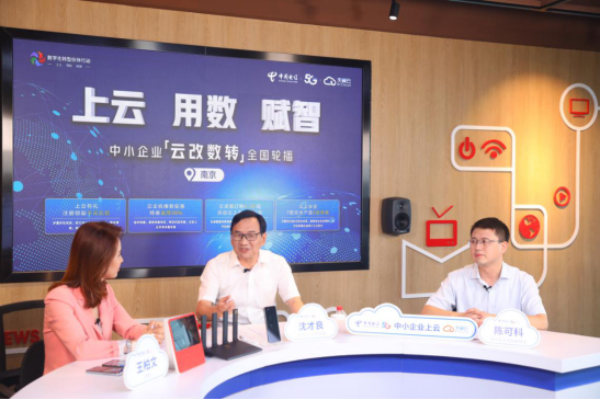 8月21日,南京电信总经理沈才良、南京市工信局副局长陈可科和江苏广电总台主持人王柏文一起,走进直播间,向广大网友进行了一场干货满满又趣味横生的直播,一起聊聊“云上”的那些事儿,看电信如何助力中小企业“腾云驾数”。