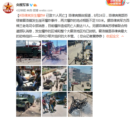 【菲律宾发生爆炸 已致11人死亡】菲律宾媒体报道,8月24日,菲律宾南部苏禄省霍洛镇发生连环爆炸事件,两次爆炸的地点相距不足100米。据菲律宾军方西棉兰老岛司令部消息,目前爆炸造成死亡人数达11人。另据菲律宾苏禄省联合特遣部队消息,发生爆炸的区域和整个大霍洛地区均已封锁。霍洛镇是菲律宾最大的恐怖组织——阿布沙耶夫组织的大本营。(总台记者黄铮铮)