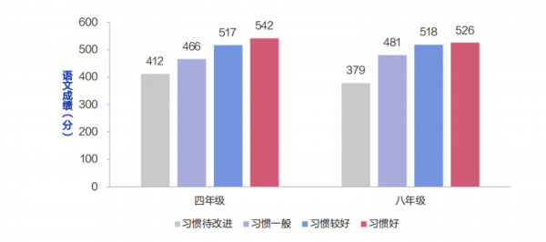 众所周知,学习习惯也影响着学生的成绩。单就语文一门学科的学习来讲,四年级、八年级语文学习习惯好的学生语文成绩分别为542分、526分,分别高出语文学习习惯待改进的学生130分、147分。
