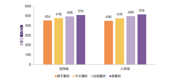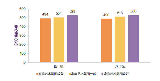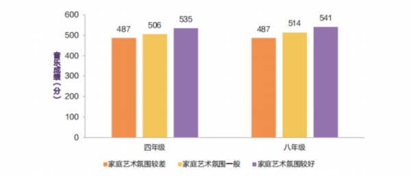 除了自身产生兴趣和良好的学习习惯之外,家庭整体的氛围也会在一定程度上提高孩子在某些方面的素质。监测结果显示,家庭艺术氛围较好的学生,艺术成绩相对较高。
