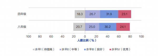 两份教育质量监测报告中还显示了有关学业水平的数据,其中81.7%的四年级学生和79.3% 的八年级学生语文学业表现达到中等及以上水平;23.1%的四年级学生和24.1%的八年级学生语文学业表现处于优秀水平,与2016年相比,四年级处于优秀水平的学生比例显著提升,八年级无显著变化。