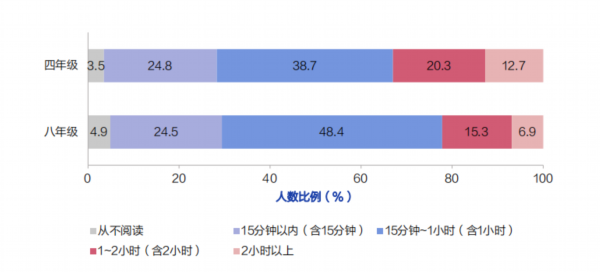 尽管家庭作业“超标”,但还是有不少学生能够拿出时间阅读。数据显示,71.7%的四年级学生和70.6%的八年级学生每天课外阅读时间可以达到15分钟以上,而且阅读时间越长,种类越丰富,语文成绩也越高。