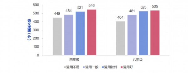 在课外阅读的过程中要有意识地主动关注文章结构、联系实际思考等。数据显示,阅读策略运用好的学生,语文成绩相对较高。四年级、八年级阅读策略运用好的学生语文成绩分别为546分、535分,分别高出阅读策略运用不足的学生98分、131分。
