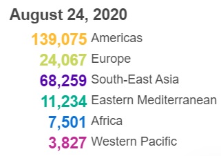 央视新闻消息,当地时间8月24日,世卫组织发布全球各地区疫情数据,全球新增新冠肺炎确诊病例253963例,新增死亡病例5501例。疫情最为严重的美洲区域确诊病例达到12423028例(新增139075例),死亡442150例(新增3574例)。详情》