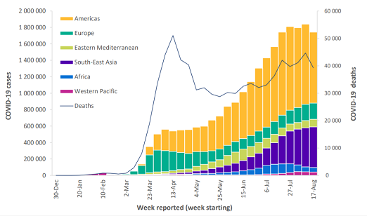 美洲区域仍然是受疫情影响最为严重的地区,上周新增确诊病例数量占到全球新增确诊病例数量的50%,新增死亡病例数量占到全球新增死亡病例数量的62%,但与前一周相比,该区域上报数据的降幅最大。东南亚区域是疫情第二严重的地区,新增病例数量仍在增加,上周新增确诊病例数量占到全球新增确诊病例数量的28%。