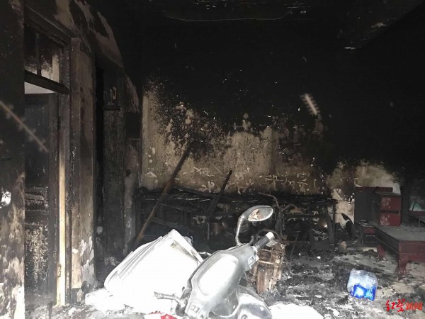 嫌犯浇上汽油纵火后的房屋内一片狼藉。