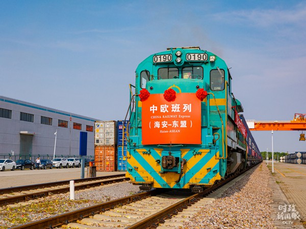 △5月26日,一列满载工业、纺织机械、光伏和电子产品的中欧(亚)班列驶出江苏海安物流基地,向越南河内进发。这是长三角地区首次开行至东盟十国的国际货运班列。