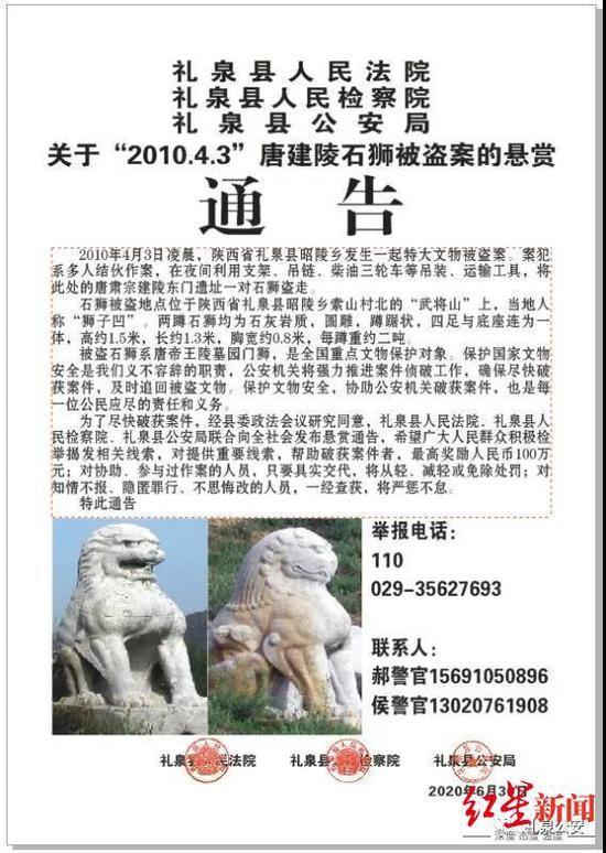 8月24日下午,礼泉县公安局官微发布《关于“2010.4.3”唐建陵石狮被盗案的悬赏通告》,通告显示,2010年4月3日凌晨,陕西省礼泉县昭陵乡发生一起特大文物被盗案,案犯系多人结伙作案,在夜间将唐肃宗建陵东门遗址一对石狮盗走。被盗石狮系唐帝王陵墓园门狮,是全国重点文物保护对象。为了尽快破获案件,经县委政法会议研究同意,礼泉县人民法院、礼泉县人民检察院、礼泉县公安局联合向全社会发布悬赏通告,希望广大人民群众积极检举揭发相关线索,对提供重要线索,帮助破获案件者,最高奖励人民币100万元。