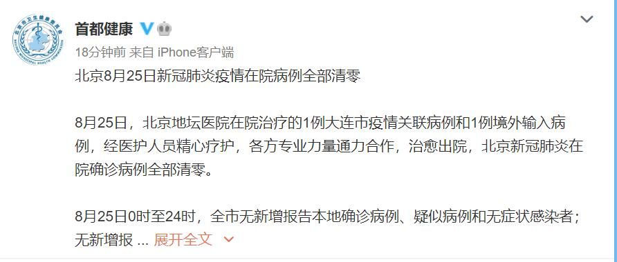 荔枝新闻讯 据@首都健康微博消息,8月25日,北京地坛医院在院治疗的1例大连市疫情关联病例和1例境外输入病例,经医护人员精心疗护,各方专业力量通力合作,治愈出院,北京新冠肺炎在院确诊病例全部清零。