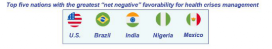受访者对50个国家和地区疫情应对措施进行评估,净支持率排名倒数最后五名的国家