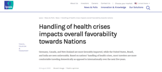 益普索网站民调报告还称,尽管愿意国际旅行的旅行者人数减少的,一些人仍愿意在未来5年内探索世界,这预示着国际旅行并不会完全停止。但旅行意愿直接受到各国对新冠危机应对方式及这些防疫措施让旅行者感到舒适程度的影响。民调结果显示,根据各国对健康危机的应对,20国受访者未来5年内最愿意前往旅行的国家和地区前五名分别为德国、瑞士、加拿大、新西兰和日本。