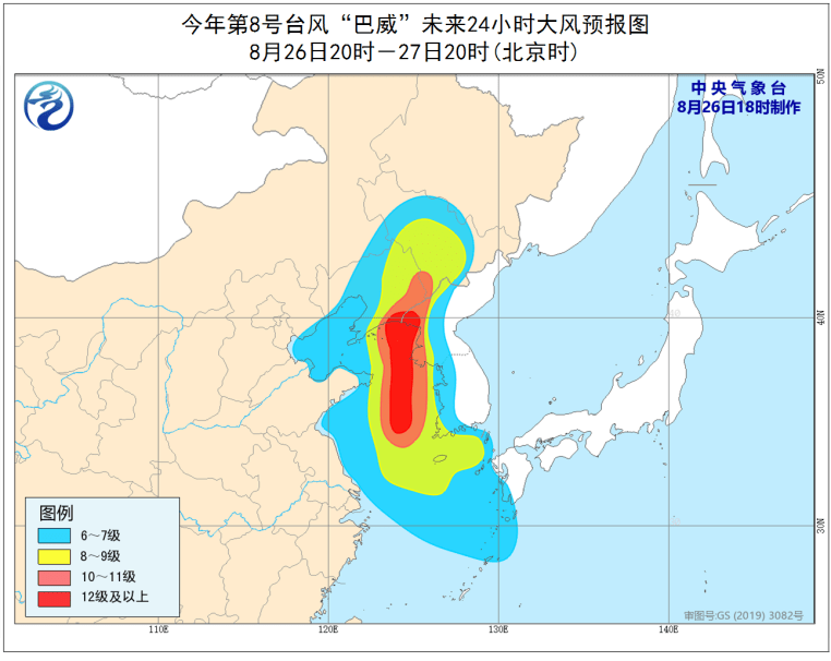 中央气象台8月26日18时发布台风红色预警:今年第8号台风“巴威”(强台风级)的中心今天(26日)下午5点钟位于黄海南部海面,距中朝交界偏南方约610公里,就是北纬34.3度、东经124.3度,中心附近最大风力有14级(45米/秒),中心最低气压为950百帕,七级风圈半径150-250公里,十级风圈半径100公里,十二级风圈半径50公里。