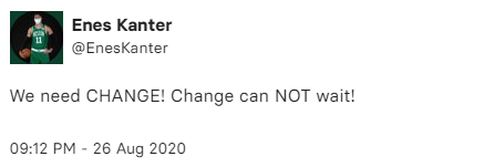 凯尔特人队球员伊内斯·坎特呼吁道,“我们需要改变!改变不能等待!”