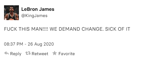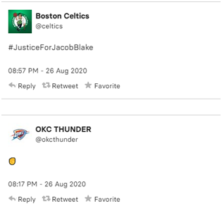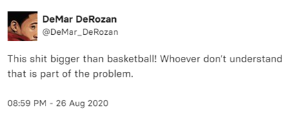 “有些事情比篮球更重要,” 当天,雄鹿队高级副总裁亚历克斯·拉里(Alex Lasry)在推特上写道,“球员和球队今天采取的立场表明,我们已经受够了。真的够了。我们要求改变。我为我们的球员感到无比自豪,我们百分之百地支持我们的球员,并为带来真正的改变提供协助。”