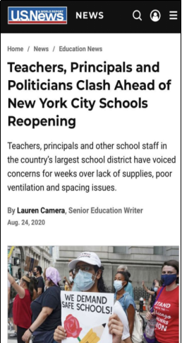《美国新闻与世界报道》指出,纽约市作为美国最大学区之一,拥有110万名学龄儿童,作为曾经的疫情重灾区,如今虽然得到有效扭转,并已将测试确诊率维持在1%,远远低于疾控中心给出的开学标准5%,但拥有如此庞大学生群体的地区全面返校,这在全美尚无先例,依然存在很大风险。教师联合工会认为,由于缺乏洗手液、清洁用品和口罩、以及通风不足,学生返校会造成“巨大崩溃”,如果市政府强迫教师复课,工会将把市长告上法庭。