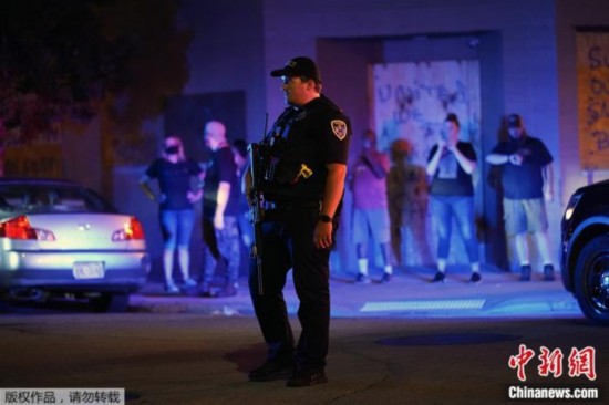 当地时间2020年8月25日,美国威斯康星州基诺沙,一名警察站在抗议者聚集的街道上。