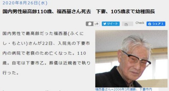 日本最长寿男性福西基于8月22日去世,享年110岁。图片来源:日本《茨城新闻》报道截图