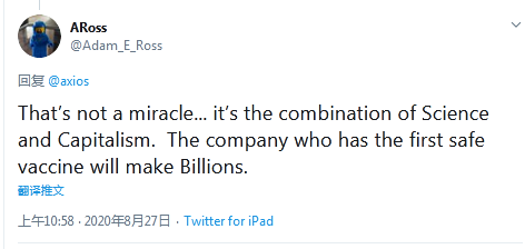 美国网友ARoss评论说:“这不是什么奇迹……这是科学与资本主义的结合。拥有首款安全疫苗的公司将会赚取数十亿美元。”↓