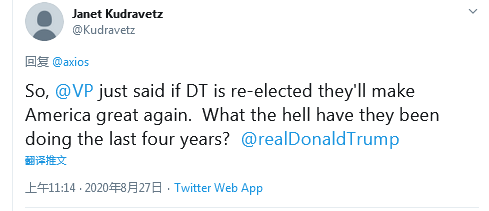 美国网友Janet Kudravetz同时@彭斯以及美国总统特朗普:“所以,副总统刚说的如果特朗普再次当选,他们将使美国再次伟大。那最近四年来他们到底在做什么? ”↓